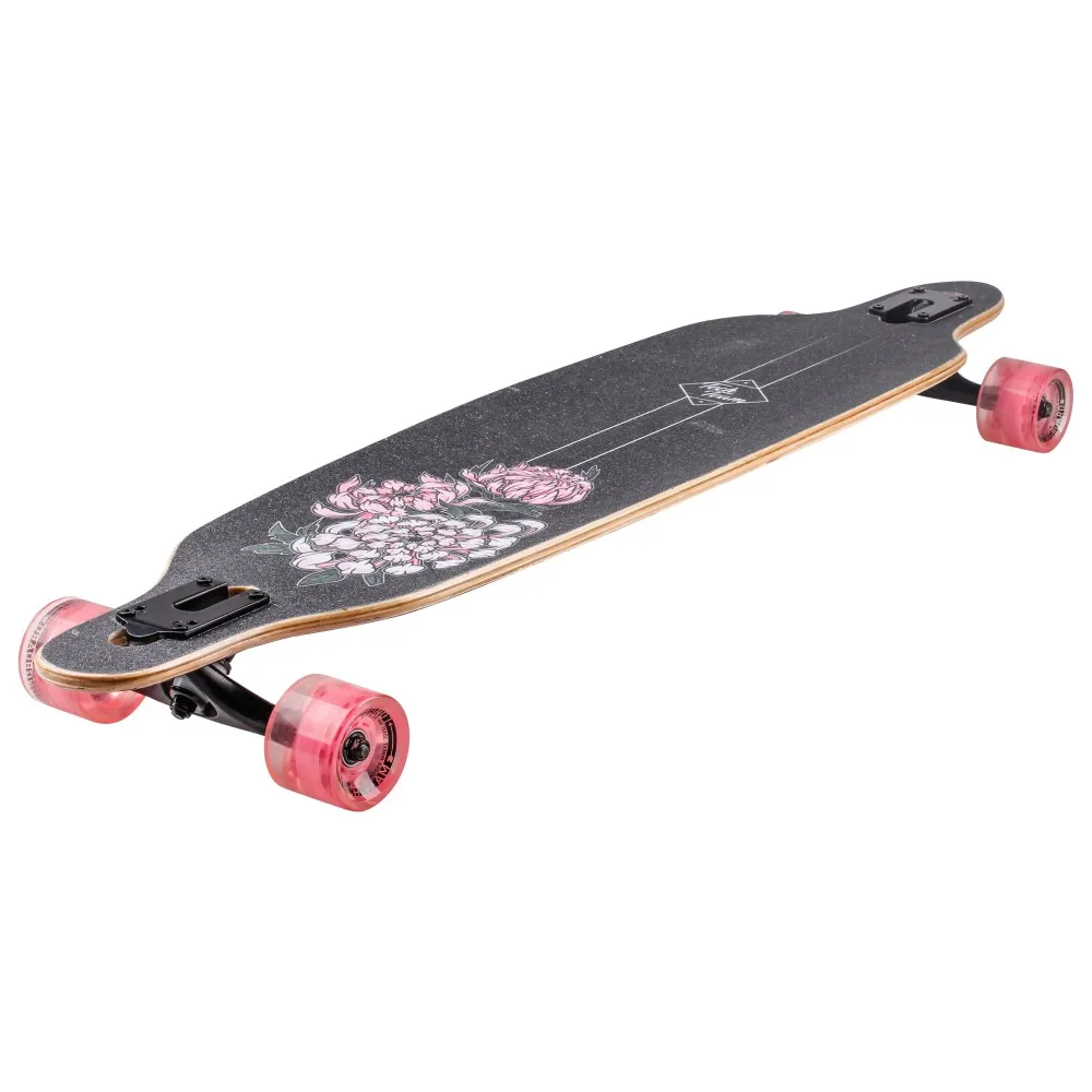 Дека имеет размеры 41 дюйм. Покрыта нескользящей брендовой шкуркой. Верхняя часть обозначена фирменным принтом. 7-дюймовая подвеска из высокопрочного алюминия качественная, проверена многочисленными отзывами райдеров. Колеса диаметром 70 мм, шириной 51 мм и параметрами жесткости 82А изготовлены из нестираемого долговечного материала. Вместе с подшипниками ABEC 7 CHROME и бушингами жесткостью 95 А езда превращается в удовольствие. Технические параметры модели позволяют развлекаться и маневрировать. Для заказа лонгборда предлагаем связаться с менеджером интернет-магазина.