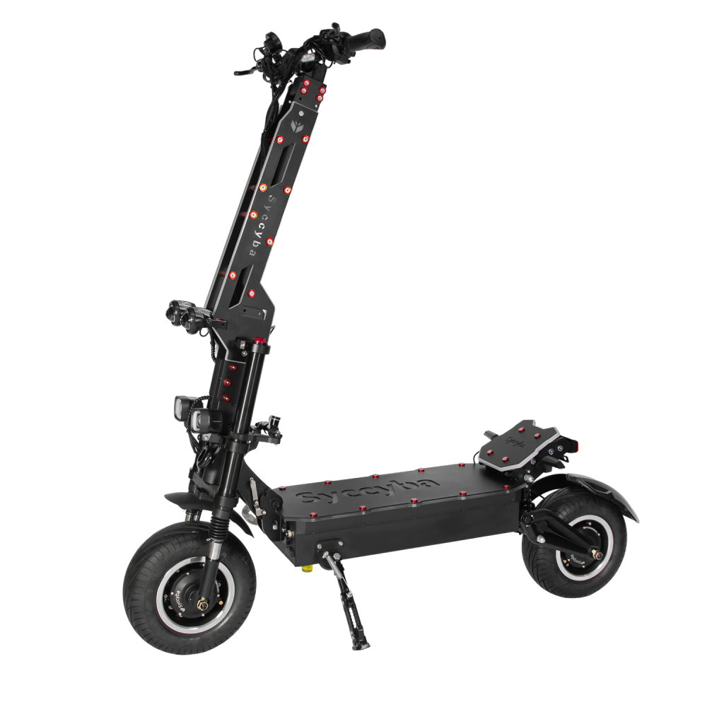 Электросамокат Syccyba Goliaf — полноприводный внедорожник премиум-класса с пиковой мощностью 11000 Вт, максимальной скоростью 110 км/ч, пробегом до 100 км и грузоподъемностью до 150 кг, предназначенный для экстремальной езды по бездорожью.