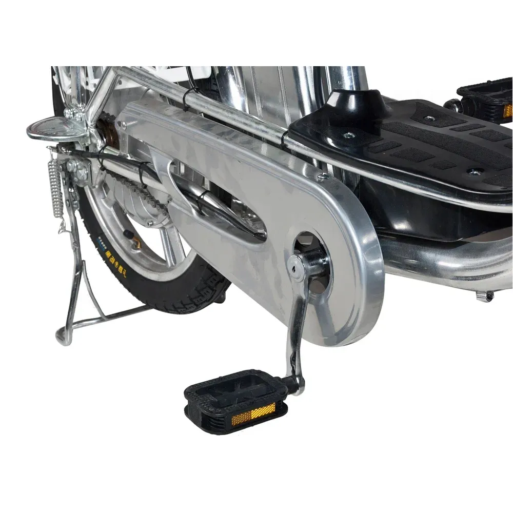 При мощности двигателя 500 Вт максимальная скорость составляет 55 км/час. Наличие емкой АКБ в сочетании с другими элементами тс допускает преодоление 55 км пути на 1 подзарядке. При переходе на педальный режим дальность пути увеличивается. Безопасность ездока обеспечена качественной гидравлической системой, отлично сцепляемыми с поверхностью большими колесами, стоп фарами и зеркалом заднего вида.